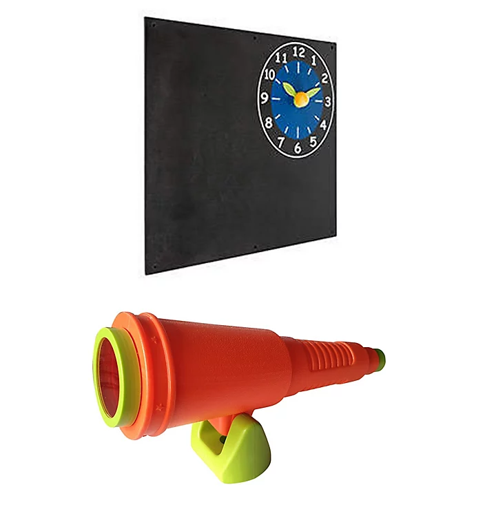 Vous souhaitez ajouter quelques accessoires funs ludiques : sur l’aire de jeux de vos enfants ? Découvrez notre box d’accessoires composé d’une longue-vue et d’un tableau avec une horloge aux aiguilles amovibles.