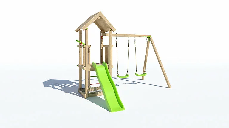 Aire de jeux » tout en un » grâce aux balançoires, bac à sable, mur de grimpe et toboggan. Bois pour une intégration harmonieuse dans les jardins