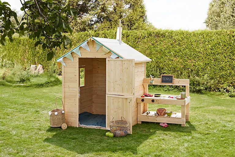 La cabane en bois Jasmine est équipée d’un plancher, d’un toit en feutre bitumeux, d’une cuisine, d’une porte et d’une fenêtre. Elle peut accueillir jusqu’à 3 enfants.