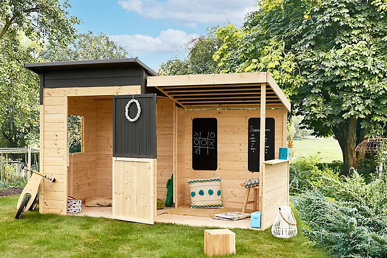 La cabane en bois monopente San Diego est équipée d’un plancher, d’un toit en feutre bitumeux, d’un préau, d’une porte et d’une fenêtre. Elle peut accueillir jusqu’à 4 enfants.