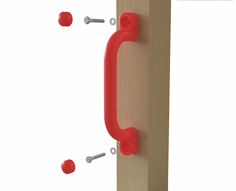 Kit de deux poignees ergonomiques en plastique, coloris rouge, avec grip pour aires de jeux section carrée . Dimensions ( Lxl) : 25 x 7,5 cm pour une poignée. Poids : 230 grammes les deux poignées