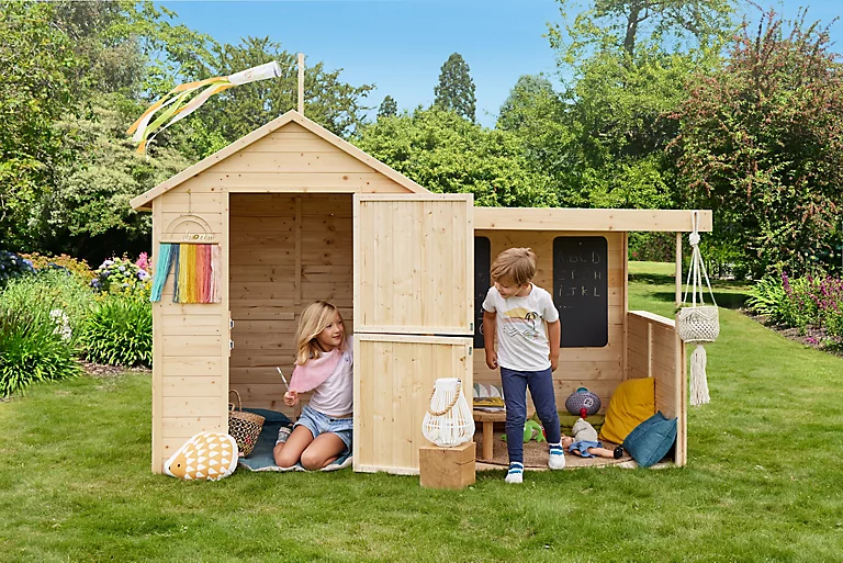 La cabane en bois Sarah est équipée d’un plancher, d’un toit en feutre bitumeux, d’un préau, d’une porte et d’une fenêtre. Elle peut accueillir jusqu’à 4 enfants.