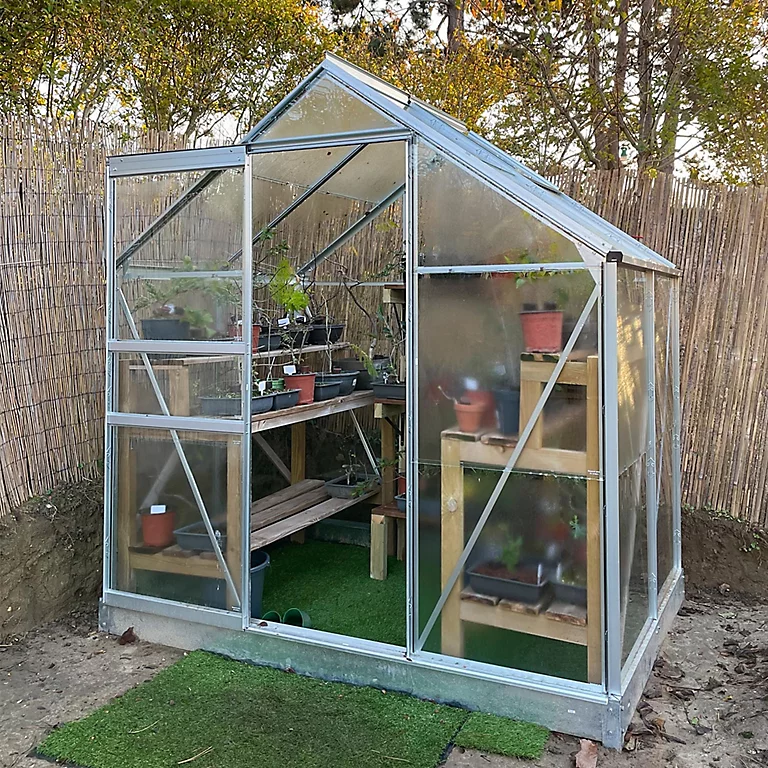 - Équipements : Structure en aluminium naturel. Parois et toiture en verre trempé 3 mm. Fixation de vitrage par clips à ressorts. 1 porte coulissante (passage de porte : l. 60 x H. 160 cm). 1 lucarne de toit (ouverture automatique de lucarne en option). La base en acier de la couleur de la serre est un socle de 12,5 cm de haut qui permet d’installer la serre directement sur la terre ou la pelouse si le sol a été rendu de niveau. Elle facilite le montage de votre serre et protège le verre des chocs (tondeuse, motoculteur…). 2 descentes de gouttière sont offertes avec votre serre de jardin LAMS. Ajustez-la en hauteur selon vos besoins. Vous pourrez ainsi installer un récupérateur d’eau de pluie.