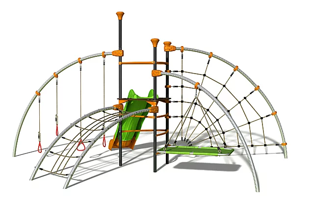 Structure de jeux EVO FOLY, de 2,70m de hauteur. Tour centrale avec plateforme anti-dérapente, composée d’un pont de singe, un toboggan de 263 cm de glisse, une araignée, un tapis volant, et des anneaux infernaux. Assemblage de la structure avec des éléments modulaires brevetés. Age recommandé : 3 à 12 ans. Scellement béton impératif avec apttes de scellement fournies. Diamètre de tube en acier : 50mm